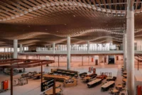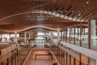 The terminal’s design is deeply rooted in the natural environment of the Cumberland Plain, a vast, open landscape characterized by its gentle horizons and iconic eucalyptus woodlands. The architectural form takes cues from this environment, with a low, horizontal silhouette and soft, flowing edges that mimic the undulating terrain of the surrounding plains. One of the most striking features of the terminal is its sculptural ceiling, which filters natural light to replicate the dappled sunlight passing through the bark of eucalyptus trees—a signature element of the Australian landscape. This interplay of light and shadow creates a dynamic, calming atmosphere that enhances the passenger experience by fostering a sense of connection to place.