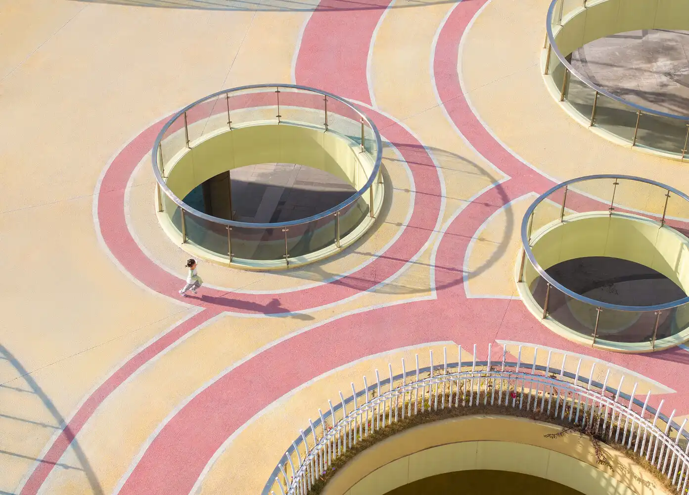 The multi-level social landscape introduced by E+UV supports a diverse range of daily activities. Circular openings puncture the platform, framing trees and allowing shafts of daylight to filter through. Children play, elders gather for conversation, and parents wait for their children after school — scenes that collectively animate the space throughout the day.