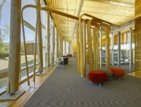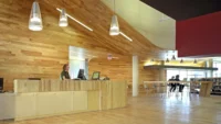 A defining feature of the Traverwood Library is its use of reclaimed Ash wood, salvaged from trees on-site and in surrounding areas that had succumbed to the invasive Emerald Ash Borer, a destructive beetle responsible for widespread deforestation in southeastern Michigan.