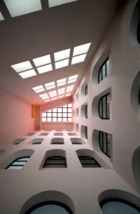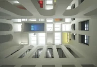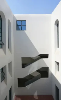 The integration of courtyards not only enhances visual and spatial richness but also supports passive environmental strategies. By facilitating cross-ventilation and providing shaded outdoor areas, the design reduces reliance on mechanical cooling, reflecting West-line studio’s commitment to sustainability. The layered and perforated interior further enables natural airflow while mitigating direct sunlight, creating a comfortable environment suitable for prolonged study and research.