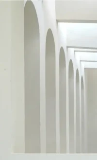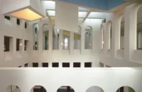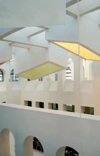 Layered arched openings punctuate the interior, sometimes running parallel and at other times enclosing inner spaces, generating a rich network of overlapping sightlines and shifting perspectives. These repetitions create a rhythm that encourages both openness and collective engagement while also offering moments of quiet contemplation. Visitors moving through the library experience a dynamic spatial journey, where viewpoints continually change and interior landscapes unfold gradually.
