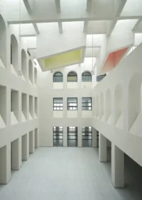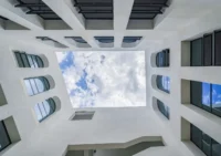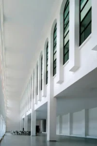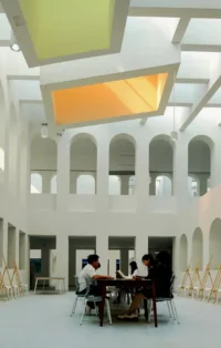One of the defining features of the library is its sculptural treatment of light. Clusters of suspended light wells descend from the roof at varying heights, diffusing ambient daylight throughout the building. These shafts of light illuminate reading and study areas softly, enhancing the comfort of users while also creating a subtle theatrical quality reminiscent of stage lighting. This is particularly fitting for a campus devoted to media, film, and broadcasting education, as the interiors metaphorically reference the drama, lighting, and presentation inherent to cinematic arts.